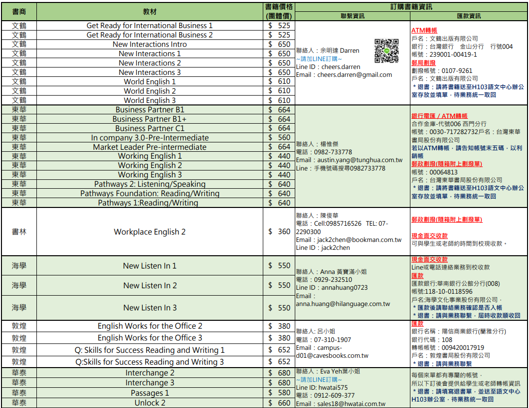 114學年度通識英語教科書訂購資訊